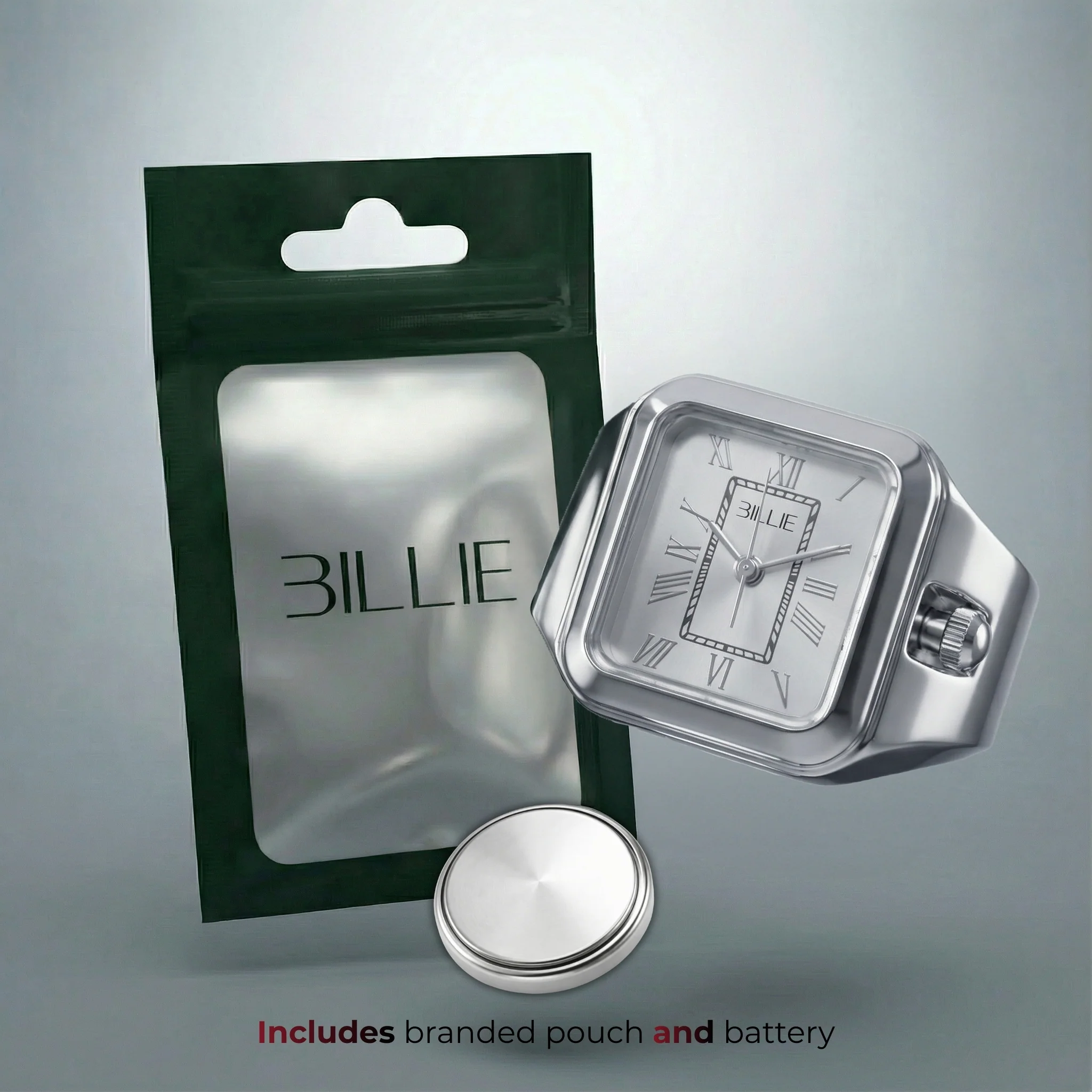 The Billie Edge Ring Watch is a unisex ring-watch with a copper-alloy case and adjustable steel band. Battery lasts about one year and is easy to replace.