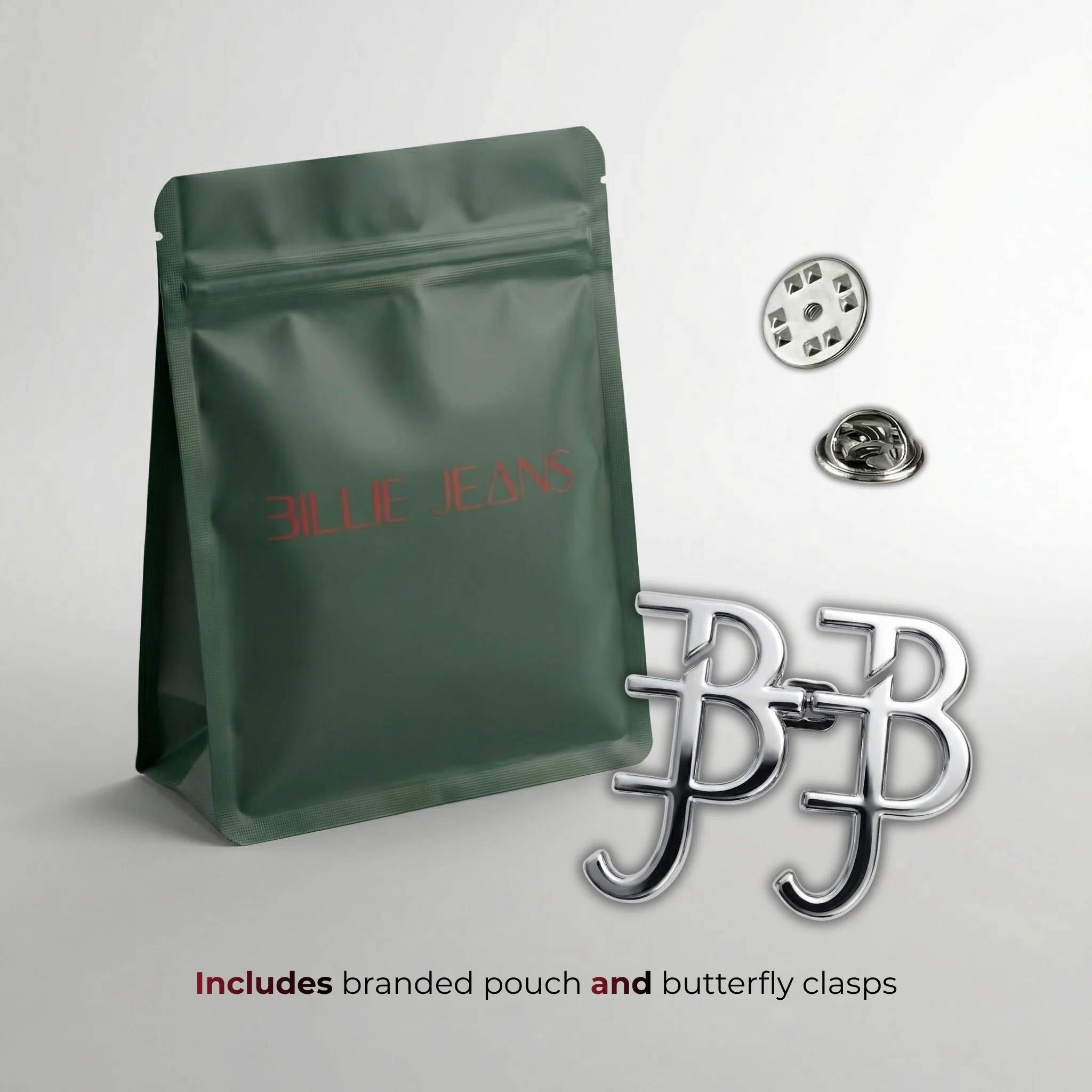 The Billie Jeans Pin Signature are two mirrored BJ monograms in chrome-polished steel. The only Billie Jeans Pin with the Billie Jeans logo.